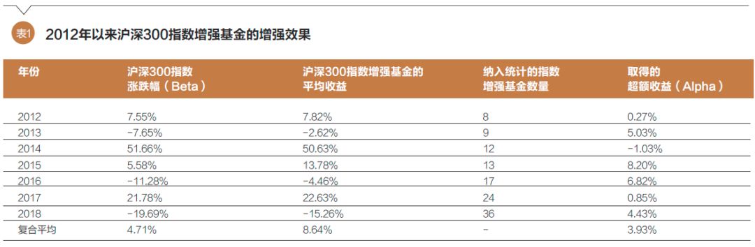 这类指数增强类基金产品不同于传统的被动管理的指数基金,不是完全复制指数成分,而是抽样复制,或者说有选择地复制指数成分,投资经理利用量化手段对指数成分进行主动的超配和低配,从而获得超出投资指数的超额收益。以沪深300指数增强基金为例,自2012年至今,除2014年指数增强基金跑输沪深300指数外,其他六年指数增强基金均跑赢了基准指数,沪深300指数的增强基金的复合年化投资回报率为8.64%,高于沪深300指数4.71%,超额收益达到3.93%(如表1所示)。